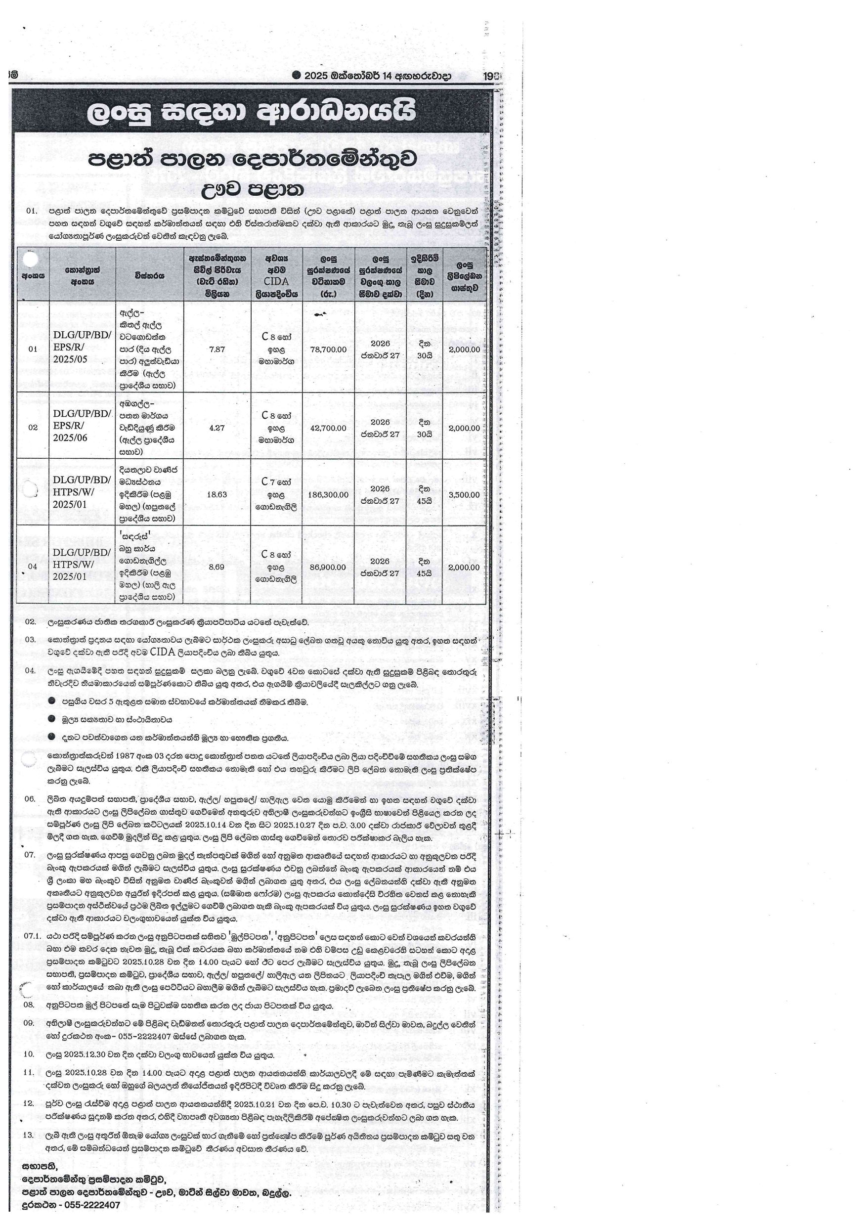 | දියතලාව සති පොළ ගාස්තු සහ නගරයේ වාහන සඳහා ගාස්තු අය කිරීම සඳහා බදු දීම – 2026 | Download | |